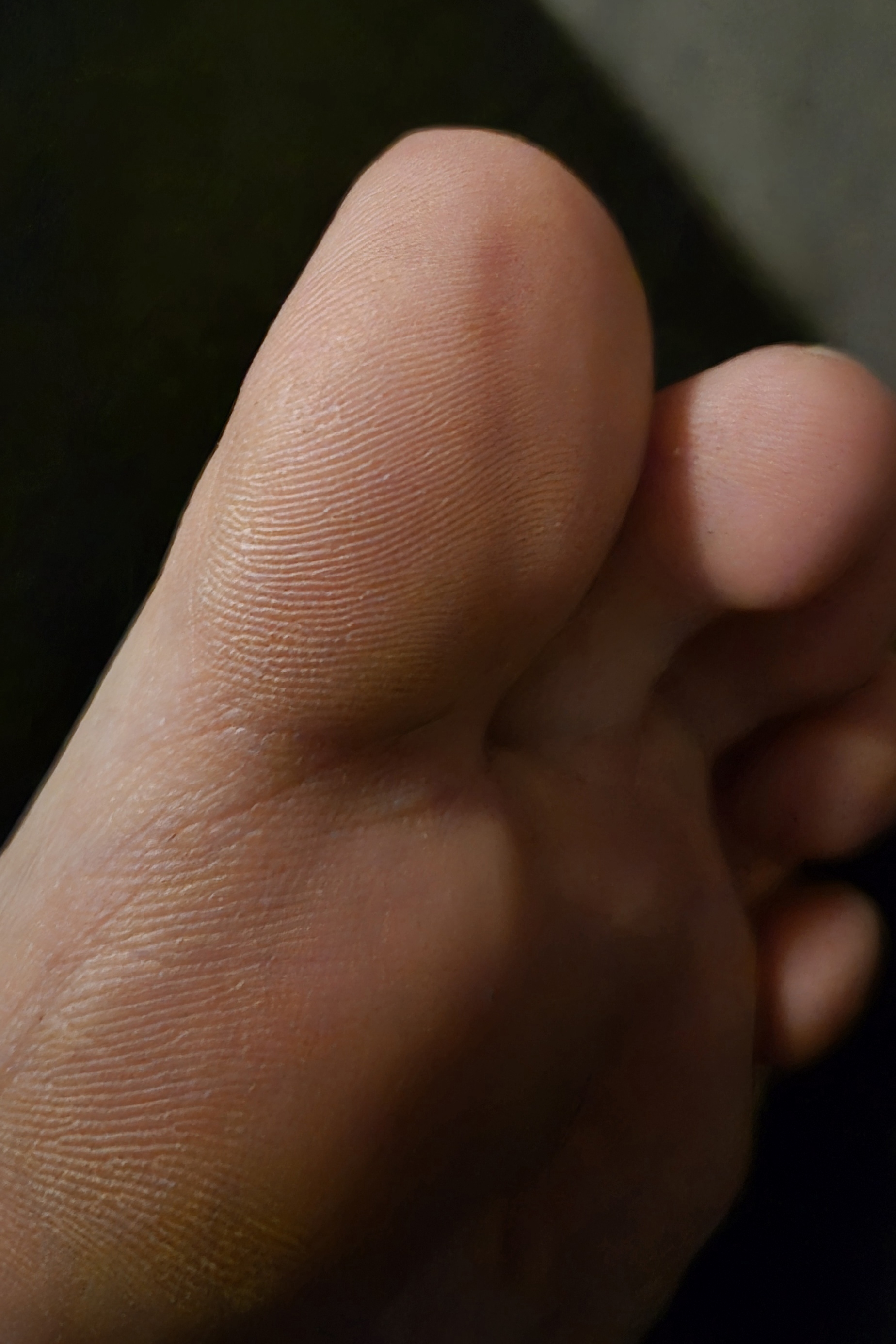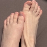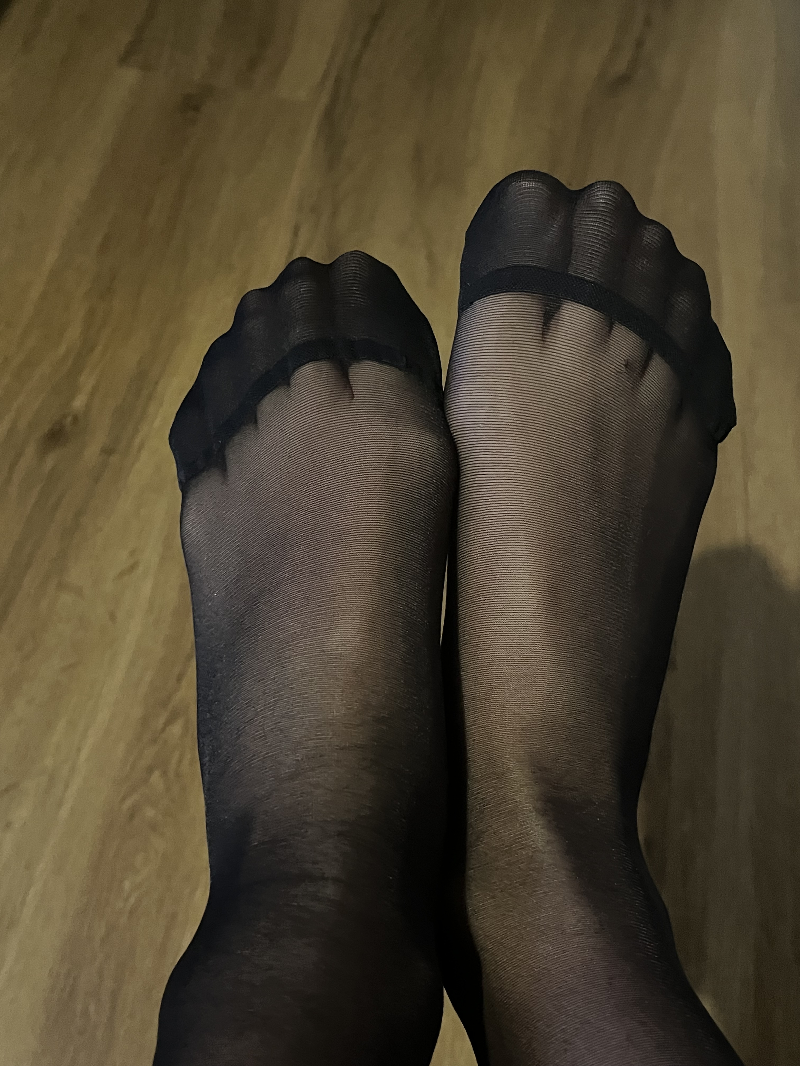 Well-groomed feet, no nail polish, black fishnet stockings.