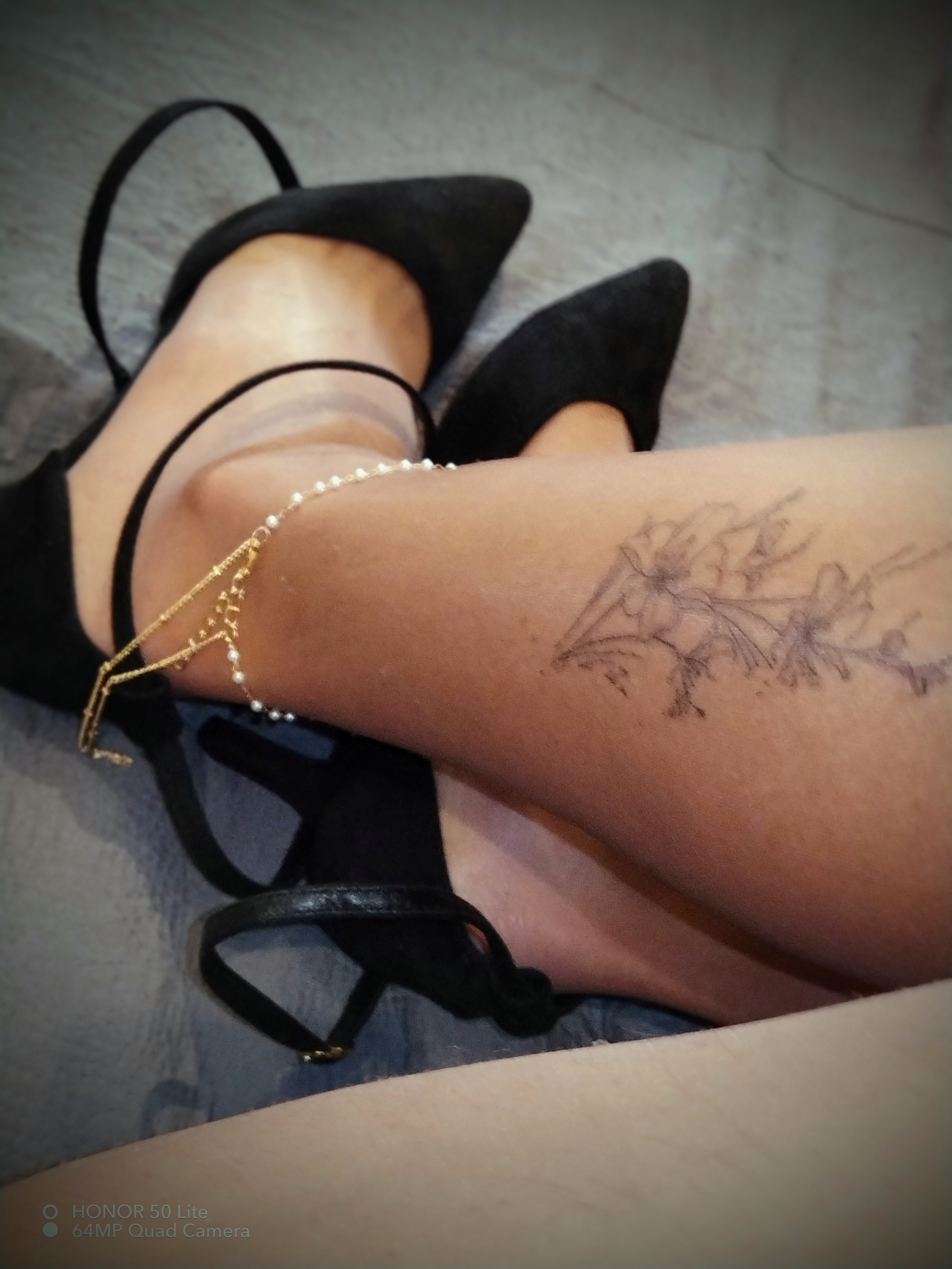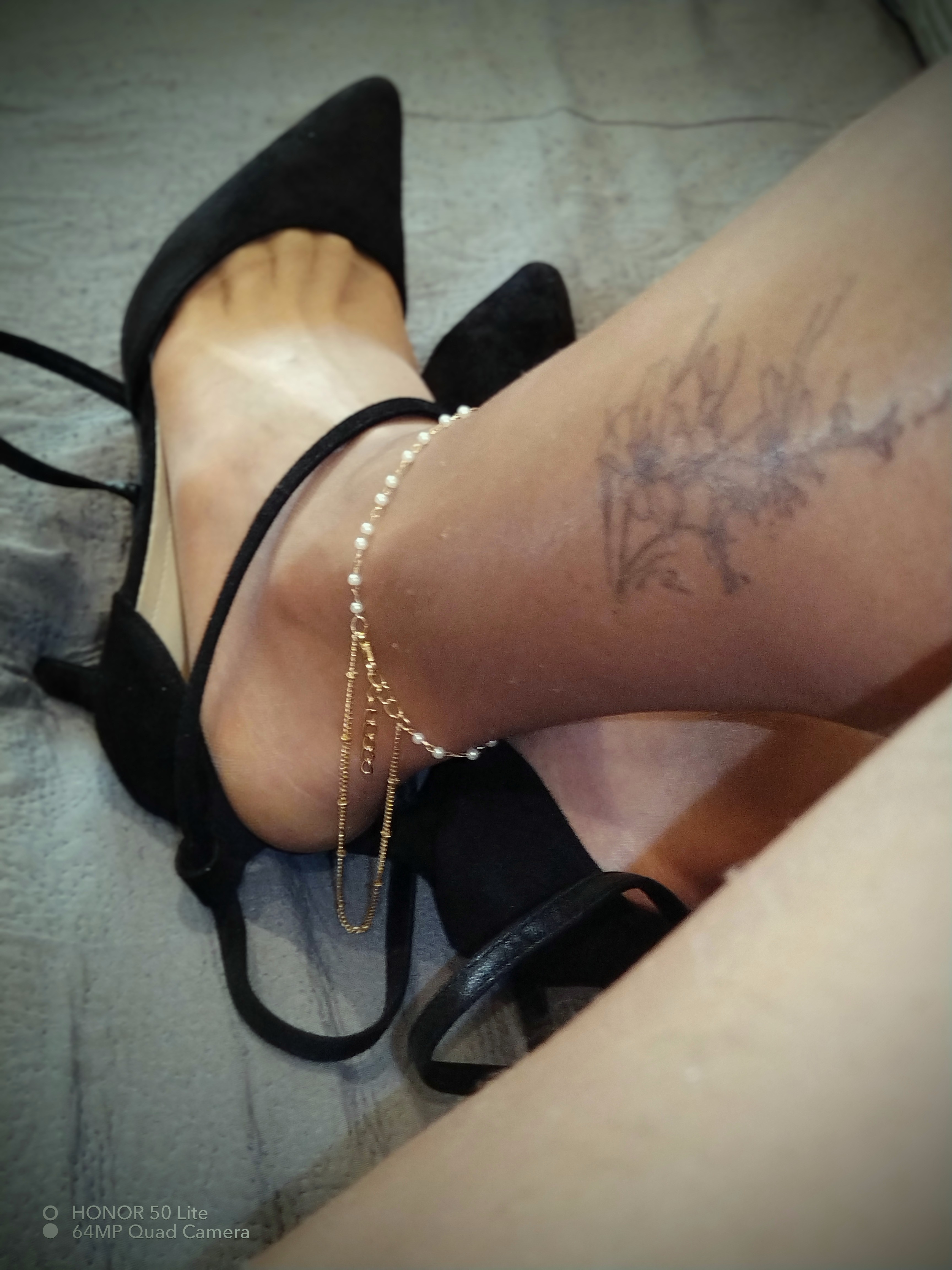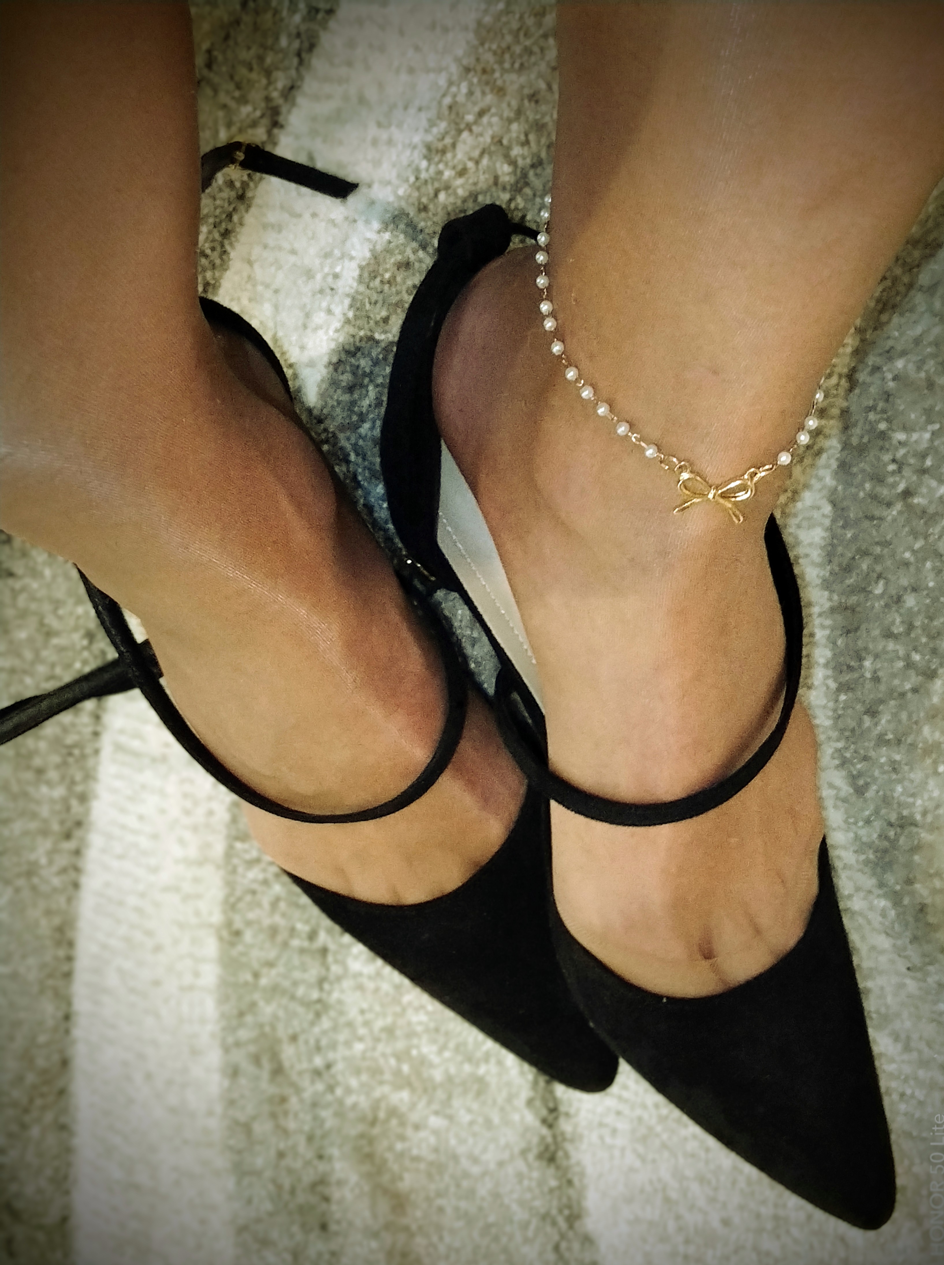 Schwarze Netzstrumpfhose, gepflegte Füße, kurze Nägel ohne Lack, klare Bilder.